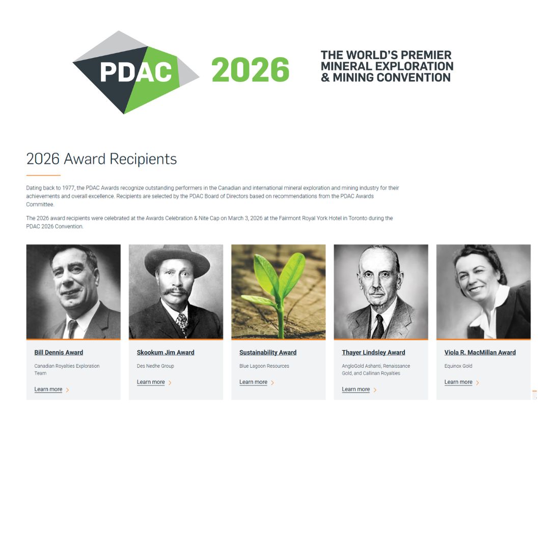 November 4, 2025, Toronto, Canada – The Prospectors & Developers Association of Canada (PDAC) is pleased to announce the recipients of the 2026 PDAC Awards, celebrating the people and partnerships driving discovery, development, and sustainable growth in the mineral industry.